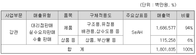 당사는 단일 사업부문(강관 제조 및 판매)으로 구성되어 있으며, 배관용, 유정용, 구조용 등에 사용되는 강관 제품을 생산 및 판매하고 있습니다. 주요 원재료는 HR Coil 등으로, (주)포스코 등에서 구매하고 있습니다.