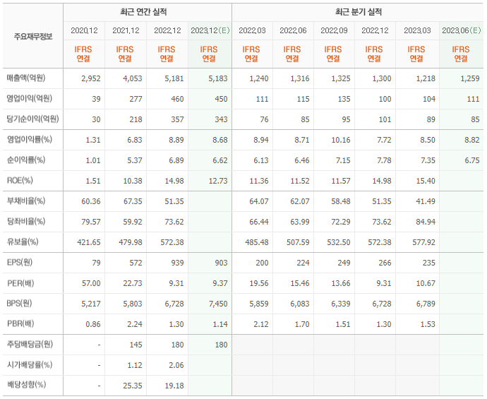 2022년 매출은 5181억, 영업이익은 460억, 당기순이익은 357억입니다. 그리고 영업이익률은 8.89%입니다.