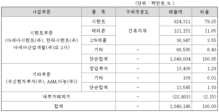 당기말 현재 당사는 사업의 성격에 따라 2개의 부문(시멘트, 기타)으로 구분하였습니다. 회사 및 종속회사의 사업부문별 현황을 요약하면 아래와 같습니다.
