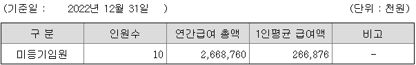 미등기임원의 평균연봉은 2억 6600만원이고 직원수는 10명입니다.