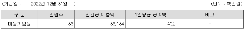 미등기임원의 평균연봉은 4억 200만원이고 직원수는 83명입니다.