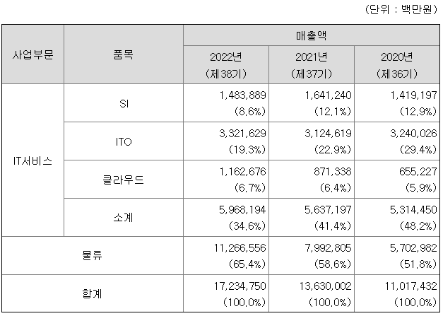 당사와 연결종속회사가 영위하고 있는 주된 사업은 IT서비스와 물류 2개 사업부문으로 구성되어 있습니다.