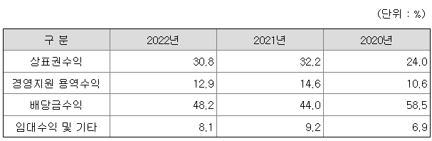 당사의 주요 수익은 BGF 브랜드의 사용자로부터 수취하는 브랜드 사용수익, 업무용역제공을 통한 경영지원 용역수익, 자회사 등으로부터 수취하는 배당금 수익 및 임대수익입니다.