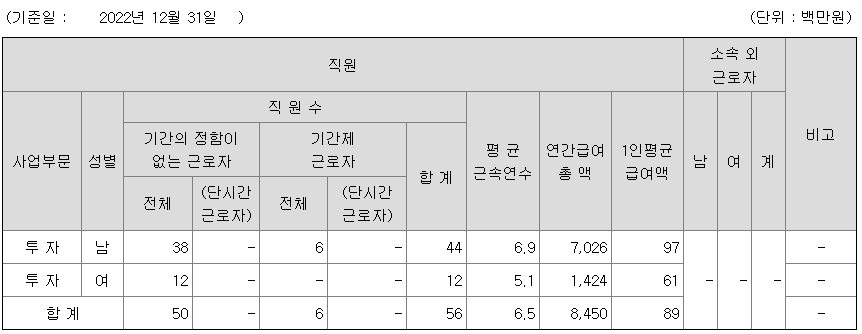 | 사업부문 | 성별 | 직원수 | 평균근속연수 | 평균연봉(백만) |