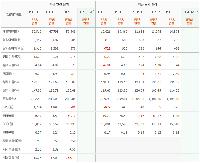 2022년 매출은 5조 449억, 영업이익은 1585억, 당기순이익은 370억입니다. 그리고 영업이익률은 3.14%입니다.