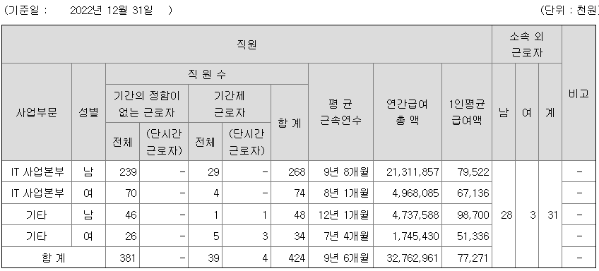 | IT 사업본부 | 남 | 268 | 9년 8개월 | 79 |