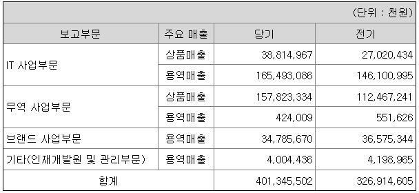 당사의 사업 부문은 연결대상회사이자 주요종속회사인 디비에프아이에스(주)를 포함하여 크게 IT분야의 SI(System Integration) 및 ITO(IT Outsourcing) 서비스 중심의 IT사업부문과 화학 및 철강제품 등의 무역업을 영위하는 무역사업부문, 'DB' 상표권 관리를 비롯해 그룹의 브랜드와 광고 활동을 총괄하는 브랜드사업부문으로 구성되어 있습니다.