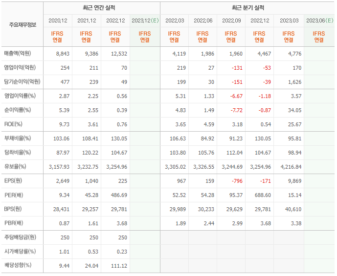 2022년 매출은 1조 2532억, 영업이익은 70억, 당기순이익은 49억입니다. 그리고 영업이익률은 0.56%입니다.