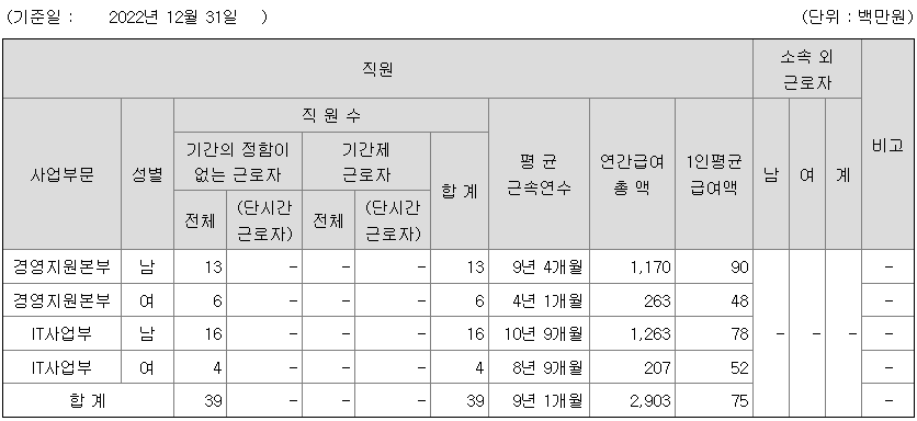 | 사업부문 | 성별 | 직원수 | 평균근속연수 | 평균연봉(백만) |