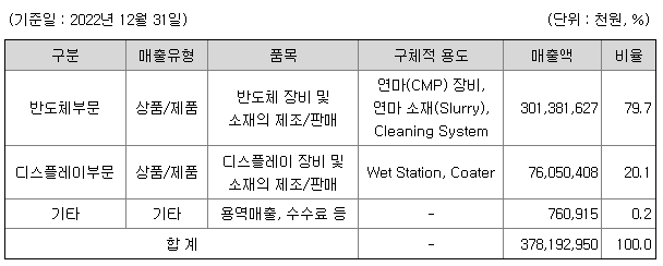 반도체 장비 제품으로는 CMP, Wet Cleaning System이 있으며, 디스플레이장비는 Wet Station, APP, CO2 Cleaner, Coater가 있습니다. 그리고 소재는 Ceria Slurry, Silica Slurry, Zirconia, Hollow Silica가 있습니다. 보고 부문에 대한 매출정보 및 제품별 주요 내용은 아래와 같습니다.