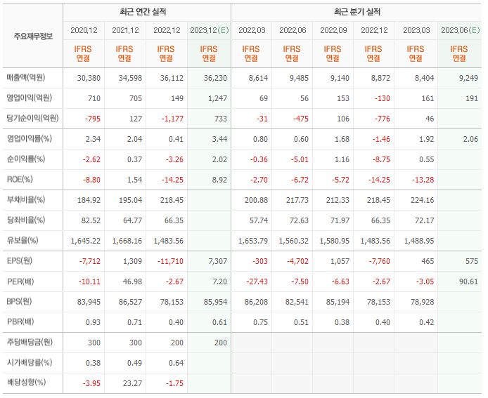 2022년 매출은 3조 6112억, 영업이익은 149억, 당기순이익은 -1177억입니다. 그리고 영업이익률은 0.41%입니다.