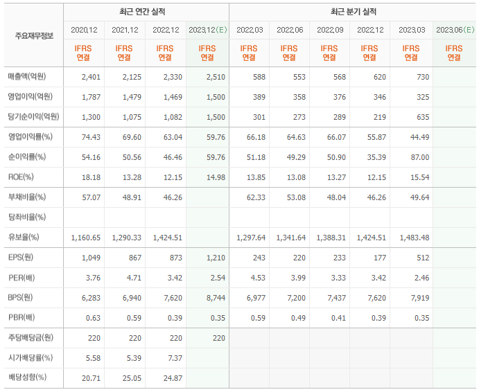2022년 매출은 2330억, 영업이익은 1469억, 당기순이익은 1082억입니다. 그리고 영업이익률은 63.04%입니다.