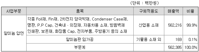 당사의 제품은 알미늄판 단일 제품이며 기타 알미늄판 임가공이 있으며 매출액 및 비율은 다음과 같습니다.