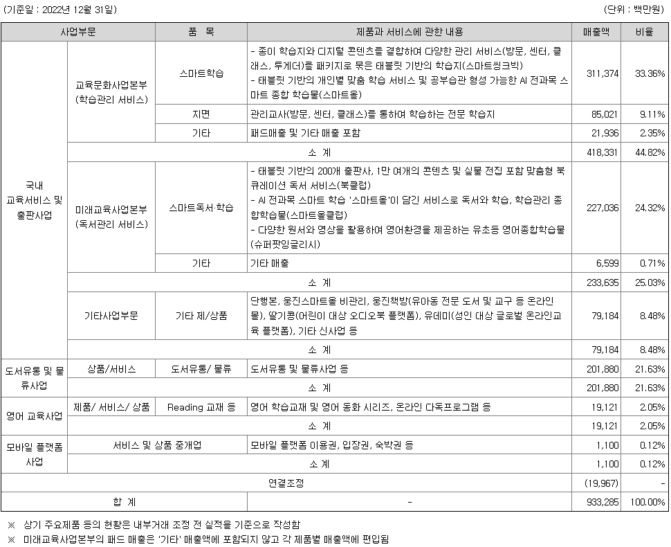 주요 제품은 웅진씽크빅과 그 종속기업의 주요 사업부문의 수익성에 중요한 영향을 미치는 제/상품이며, 연결기준으로 작성하였습니다.