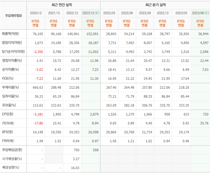 2022년 실적은 14조 961억, 영업이익은 2조 8306억입니다. 그리고 영업이익률은 20.08%입니다.