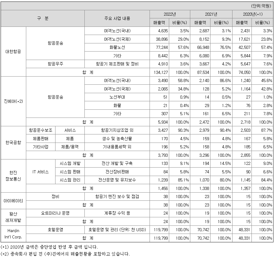 당사는 여객사업, 화물사업, 항공우주사업을 주요 사업으로 영위하고 있습니다. 러시아-우크라이나 전쟁, 글로벌 공급망 적체현상, 각국 중앙은행의 통화긴축 기조 등 불확실한 사업환경에도 불구하고 회사는 다양한 방식으로 변화에 대응하고 있습니다. COVID-19 상황이 안정화되면서 여객수요가 점진적으로 증가하였으며, 국제선 공급 확대 및 환승수요 판매 제고를 통해 여객 매출을 증대시켰습니다. 이에 더해 화물기 가동률 제고 및 화물운송수익 극대화 전략을 지속적으로 구사하여 2022년 영업수익은 별도기준 전년대비 53.2% 증가한 13조 4,127억원을 기록하였습니다. 또한, 전 부문에 걸친 업무 프로세스 개선 및 생산성 제고를 통해 비용 절감 활동을 적극 추진한 결과, 영업이익은 전년동기 대비 1조 4,192억원 증가한 2조 8,836억원의 흑자를 시현하였습니다.