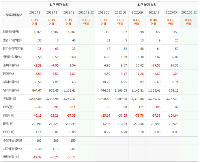 2022년 매출은 1307억, 영업이익은 48억, 당기순이익은 33억입니다. 그리고 영업이익률은 3.68%입니다.