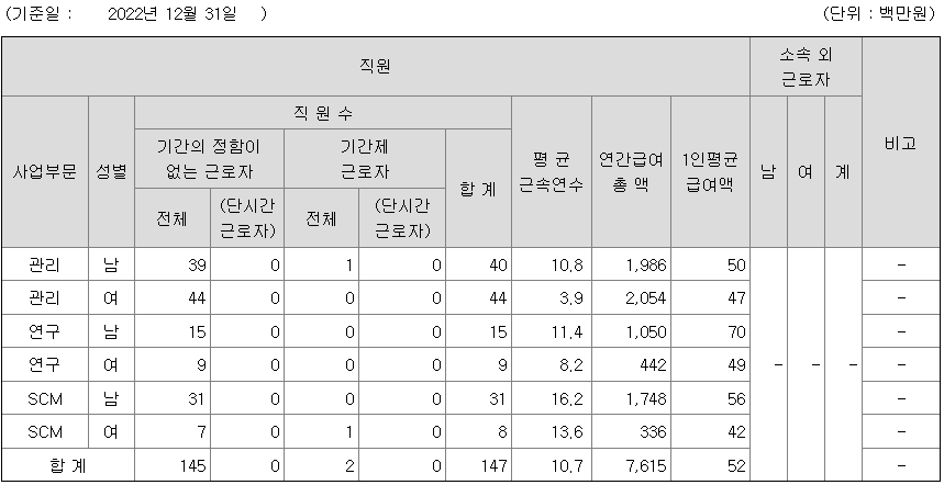 | 사업부문 | 성별 | 직원수 | 평균근속연수 | 평균연봉(백만) |