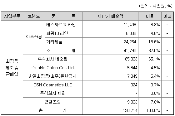 당사의 매출은 주력 브랜드인 잇츠스킨의 경우 데스까르고 라인, 파워10 라인 및 기타 제품 라인으로 구분할 수 있으며, OEDM부문 및 연결대상 종속회사의 매출도 추가됩니다.