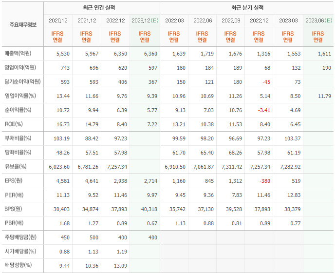 2022년 매출은 6350억, 영업이익은 620억, 당기순이익은 406억입니다. 그리고 영업이익률은 9.76%입니다.