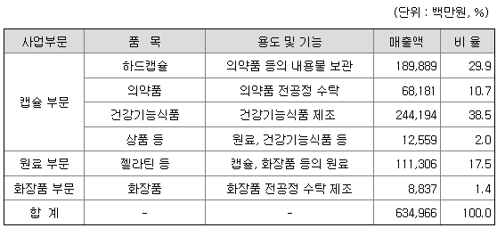 회사는 하드캡슐 제조, 소프트캡슐 제형의 의약품 전공정 수탁, 건강기능식품 생산, 원료 및 화장품 사업 등을 영위하고 있습니다.