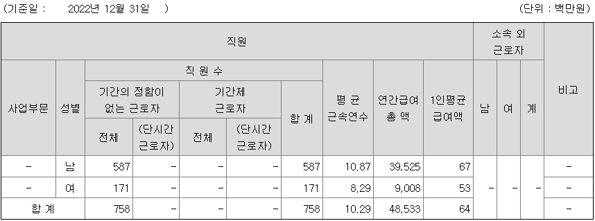 | 사업부문 | 성별 | 직원수 | 평균근속연수 | 평균연봉(백만) |