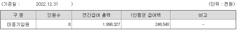 미등기임원의 평균연봉은 2억 4800만원이고 직원수는 8명입니다.