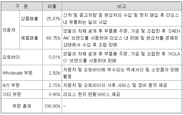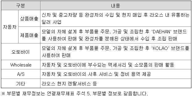 당사의 종속회사인 Auto World(KOLAO Developing) Co., Ltd.은 라오스에서 CBU(Completely Built Up, 완성차) 신차 판매, SKD(Semi Knock-Down)/CKD(Complete Knock-Down) 신차 제조 및 판매, 오토바이 제조 및 판매, 부품 판매 및 A/S 등을영위하고 있는 업체입니다. 또한 부문별 중요도에 따라 당사가 현재 사업을 영위하고 있는 미얀마, 캄보디아, 베트남의 사업 내용에 대해 추가적으로 기술하겠습니다.