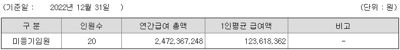 미등기임원의 평균연봉은 1억 2300만원이고 직원수는 20명입니다.