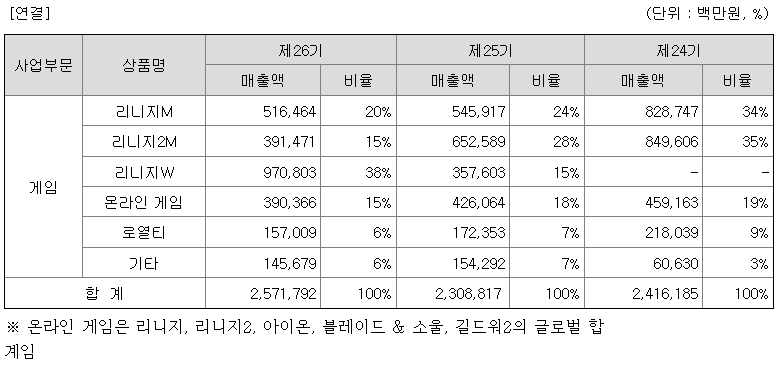 당사 주력 모바일게임으로는 리니지M, 리니지2M, 리니지W, 블레이드 & 소울 2 등이 있으며, 온라인게임으로는 리니지, 리니지2, 아이온, 블레이드 & 소울, 길드워2 등이 있습니다. 2022년 영업수익의 약 37%가 해외(로열티 포함)에서 발생하고 있으며, 일본, 대만, 미국 등 전 세계 60여 개국에 NC만의 차별화된 즐거움의 가치를 전하고 있습니다.