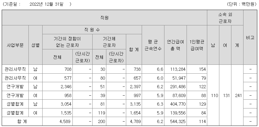사업부문 성별 직원수 평균근속연수 평균연봉(백만)