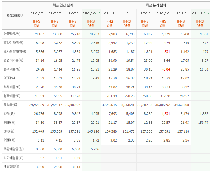2022년 실적은 2조 5718억, 영업이익은 5590억입니다. 그리고 영업이익률은 21.74%입니다.