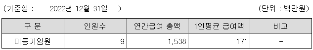 미등기임원의 평균연봉은 1억 7100만원이고 직원수는 9명입니다.