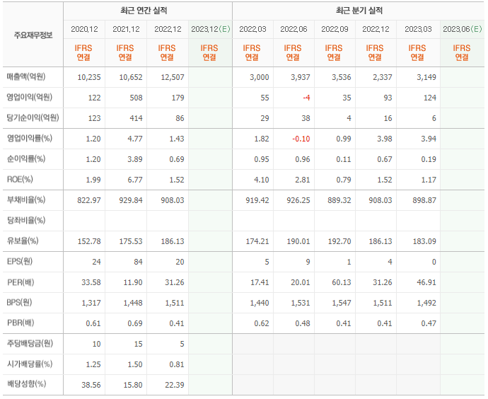 2022년 매출은 1조 2507억, 영업이익은 179억, 당기순이익은 86억입니다. 그리고 영업이익률은 1.43%입니다.