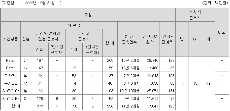 | 사업부문 | 성별 | 직원수 | 평균근속연수 | 평균연봉(백만) |