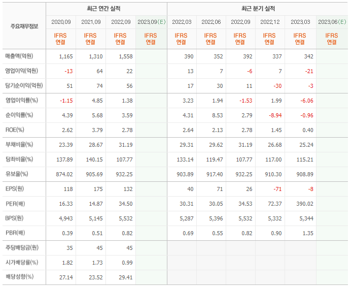 2022년 매출은 1558억, 영업이익은 22억, 당기순이익은 56억입니다. 그리고 영업이익률은 1.38%입니다.