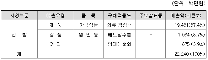 당사가 영위하는 면방산업은 원면등 단섬유(목화나 양모와 같이 짧은 섬유의 총칭)를 원료로 방적사를 제조하며, 이를 이용하여 직포 및 염색 가공하여 직물을 제조하여, 이들을 2차 섬유제품 제조업계에 공급하는 산업입니다.