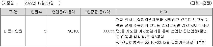 미등기임원의 평균연봉은 3000만원이고 직원수는 3명입니다.