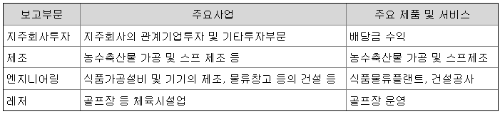 지주회사인 (주)농심홀딩스 및 그 연결종속회사의 재무제표(이하 '연결재무제표')는 다음과 같은 보고부문을 가지고 있으며, 그에 따른 주요사업, 주요 제품 및 서비스는 다음과 같습니다.