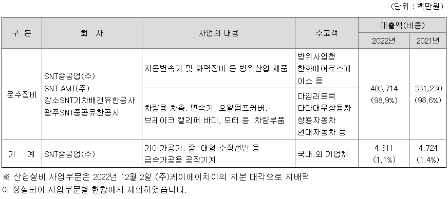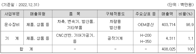 지배회사인 당사는 운수장비사업과 기계사업으로 구분됩니다. 운수장비사업은 방위산업제품(방산용 변속기 및 총화포 등), 차량부품(변속기, 차축 등)으로 구분되고, 기계사업은 공작기계 등으로 구분되어 있으며 다년간 축적된 기술과 경험으로 우수한 제품을 생산 공급하고 있습니다.