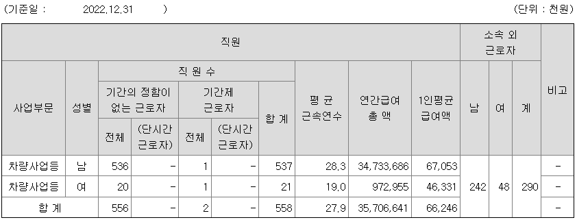 | 사업부문 | 성별 | 직원수 | 평균근속연수 | 평균연봉(백만) |