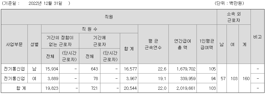 | 사업부문 | 성별 | 직원수 | 평균근속연수 | 평균연봉(백만) |