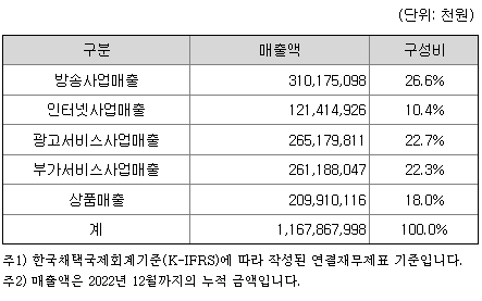 당사는 케이블TV, 초고속인터넷, 인터넷전화(VoIP), 광고, MVNO 등을 제공하는 종합유선방송사업자로서 전국 23개 권역에서 방송법 제9조 제2항 및 제17조에 의거하여 방통위로부터 방송사업자 허가/재허가 및 전기통신사업법 제6조에 의거한 기간통신사업자 허가를 득하였으며, 오리지널 및 대표콘텐츠 투자로 지역 채널 인지도를 높이고 있고, 'OEM 제조 상품'등을 통한 렌탈 할부판매 사업을 영위하고 있습니다.