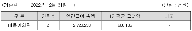 미등기임원의 평균연봉은 6억 600만원이고 직원수는 21명입니다.