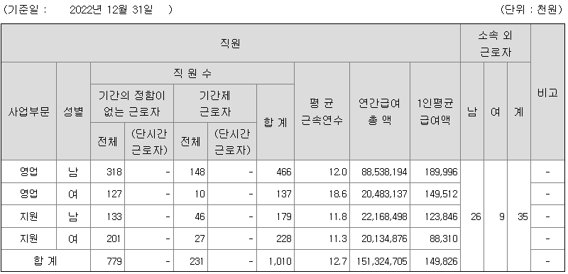 전체 평균연봉은 1억 4900만원이고 직원수는 1010명입니다.