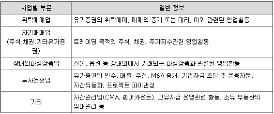 당사는 영업활동의 행태에 따라 위탁매매업, 자기매매업, 장내외파생상품업, 투자은행업, 기타의 5개 부문으로 구성되며, 이러한 영업부문은 제공되는 상품과 서비스의 성격, 고객별 분류별로 회사의 조직을 구성하여 전문화된 영업활동이 이루어 지고 있습니다.