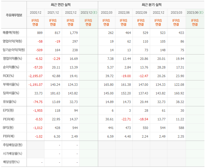 2022년 매출은 1779억, 영업이익은 297억, 당기순이익은 238억입니다. 그리고 영업이익률은 16.69%입니다.