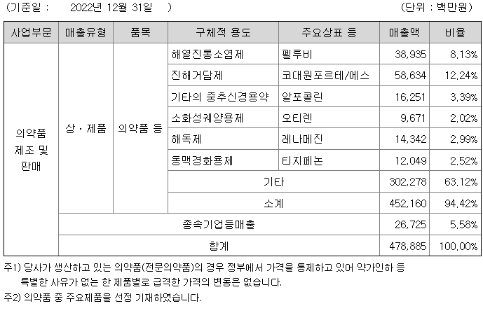 당사는 순환기, 호흡기, 소화기, 근골격계, 항생제ㆍ화학요법제, 성호르몬제, 정신신경계용약 등을 제조ㆍ판매하고 있으며, 주요 제품의 매출실적 등은 다음과 같습니다.