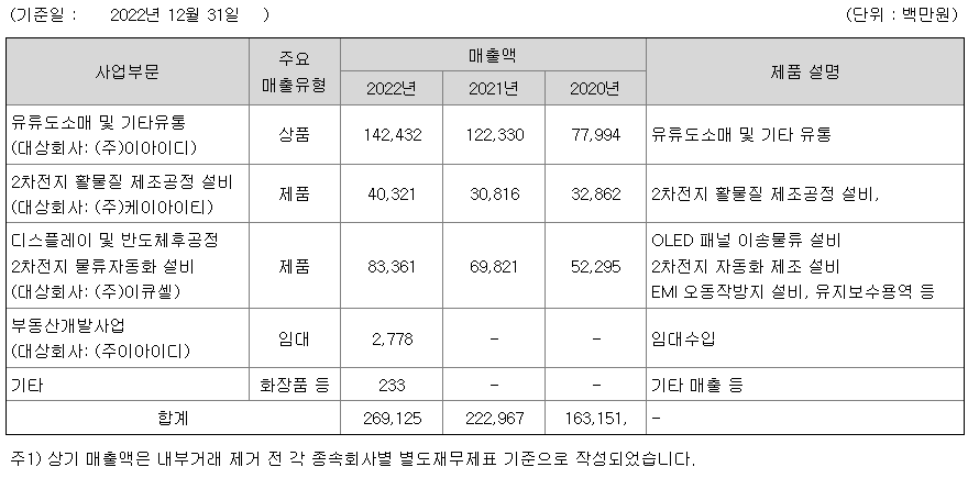 (주) 이큐셀은 디스플레이 및 반도체 후공정 제품은 Amkor등에 공급중에 있으며, 2차전지 물류자동화 설비를 제조하는 (주)지이와 당기중 합병하여 사업을 영위하고 있습니다. (주)이큐셀의 매출액은 2022년 연결 매출액의 29.85%를 차지하고 있습니다.