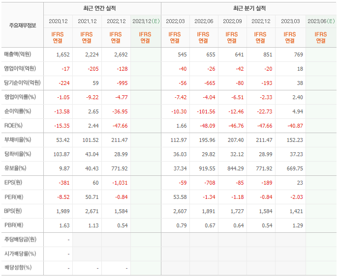 2022년 매출은 2692억, 영업이익은 -128억, 당기순이익은 -995억입니다. 그리고 영업이익률은 -4.77%입니다.